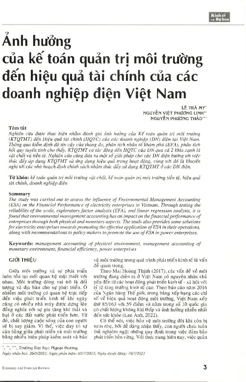 Ảnh hưởng của kế toán quản trị môi trường đến hiệu quả tài chính của các doanh nghiệp, điện Việt Nam
