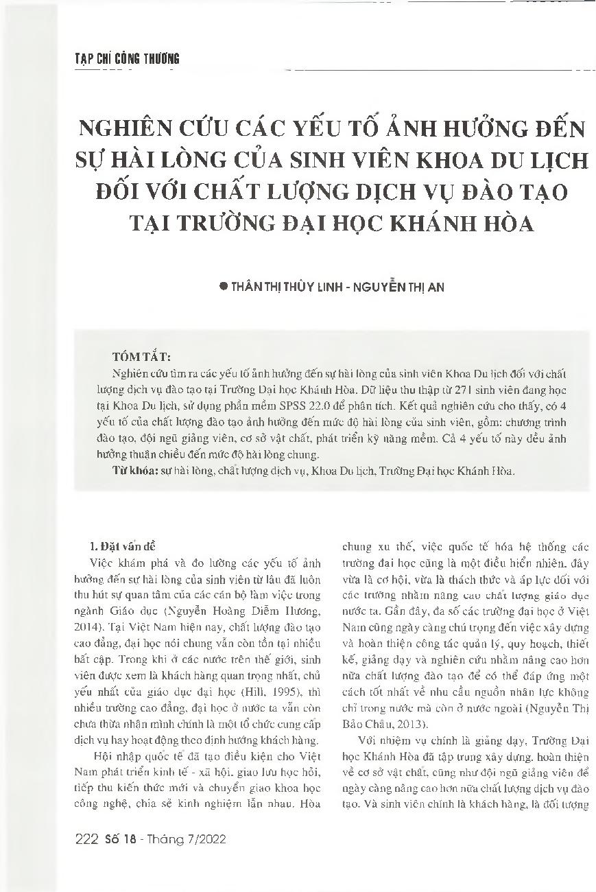 Nghiên cứu các yếu tố ảnh hưởng đến sự hài lòng của sinh viên Khoa Du lịch đối với chất lượng dịch vụ đào tạo tại Trường Đại học Khánh Hòa = A study on the factors affecting the satisfaction of Faculty of Tourism&; 39;s students with the education quality