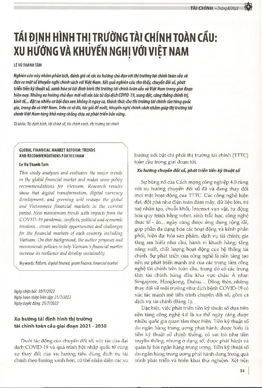 Tái định hình thị trường tài chính toàn cầu: Xu hướng và khuyến nghị với Việt Nam = Global financial market reform: Trends and recommendations for Vietnam