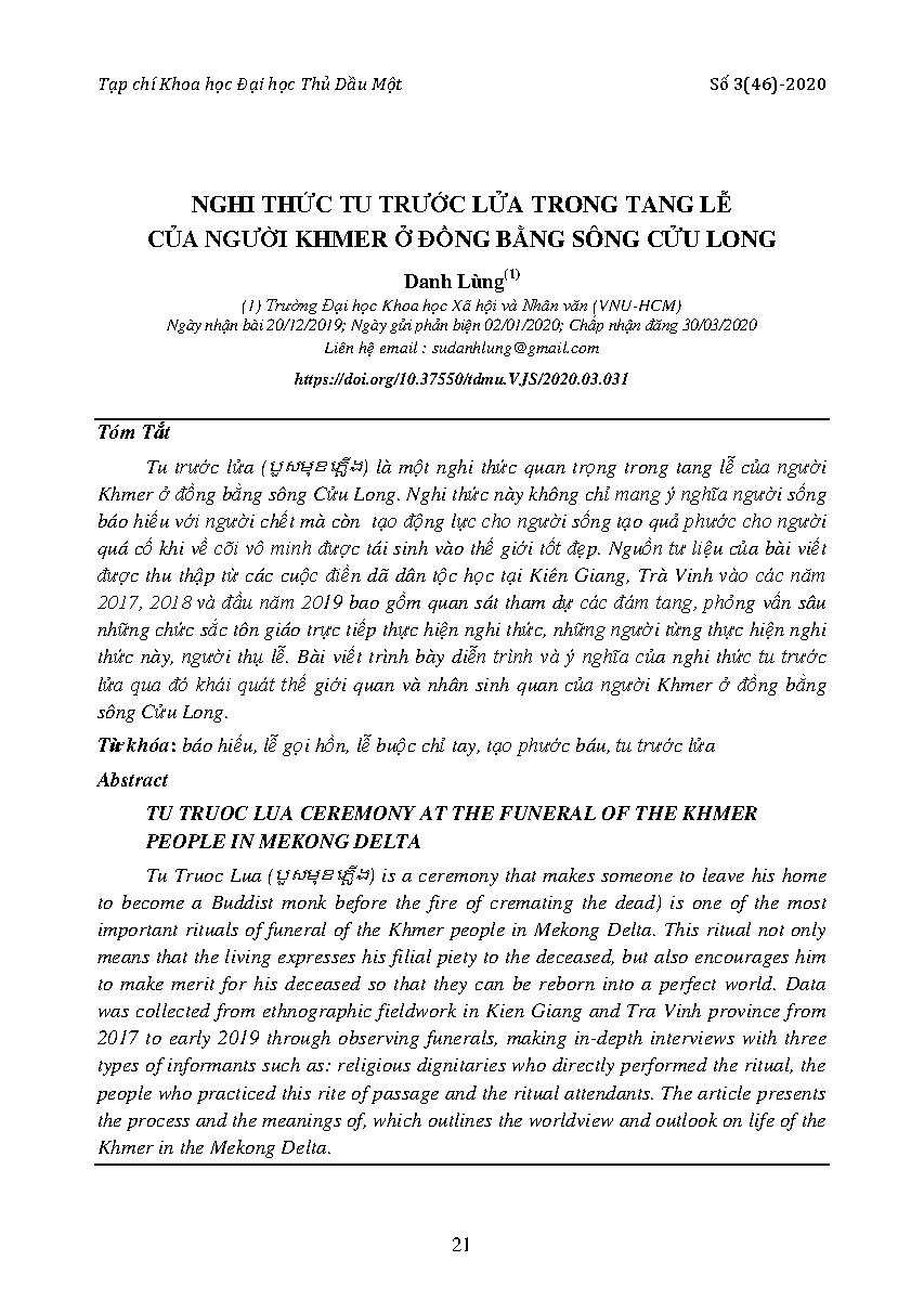 Nghi thức tu trước lửa trong tang lễ của người Khmer ở đồng bằng sông Cửu Long = Tu truoc lua ceremony at the funeral of the Khmer people in Mekong delta