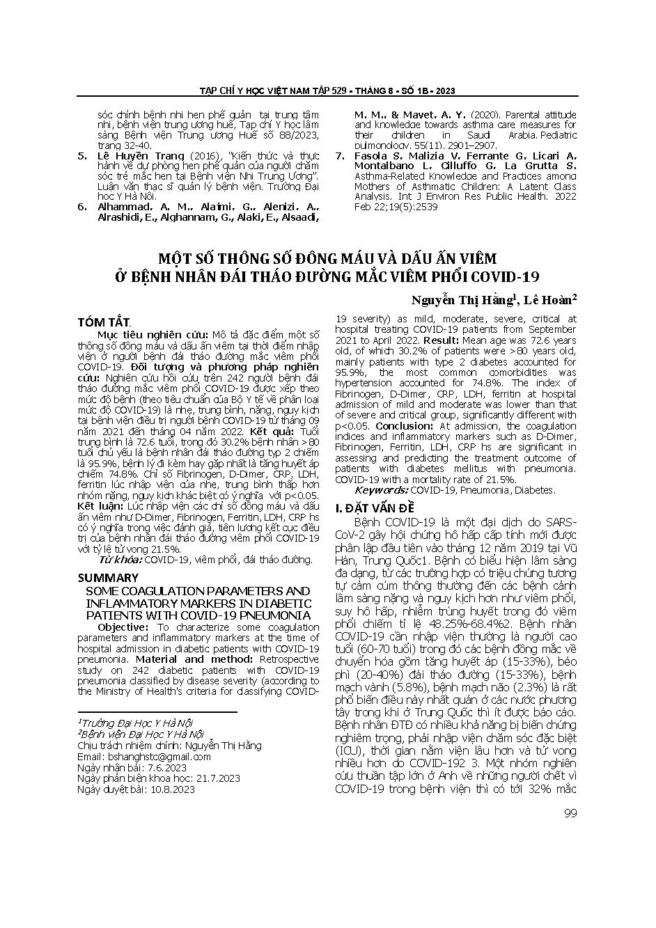 Một số thông số đông máu và dấu ấn viêm ở bệnh nhân đái tháo đường mắc viêm phổi Covid-19