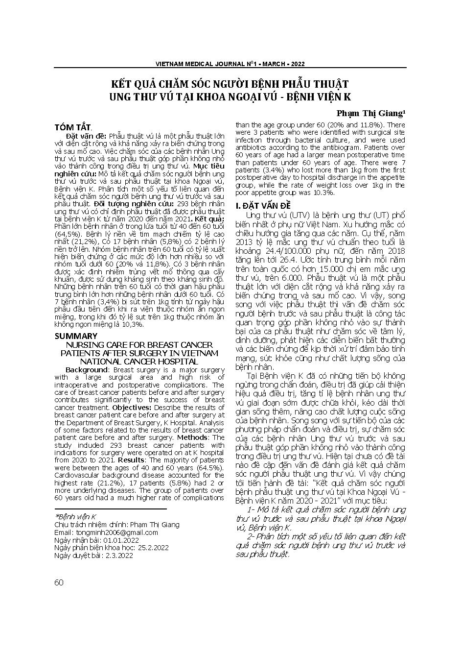 Kết quả chăm sóc người bệnh phẫu thuật ung thư vú tại khoa ngoại vú - Bệnh viện K = Nursing care for breast cancer patients after surgery in Vietnam national cancer hospital