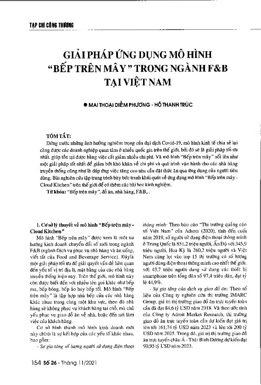 Giải pháp ứng dụng mô hình "Bếp trên mây" trong ngành F&B tại Việt Nam = The implementation of the Cloud Kitchen model in Vietnam's F&B industry