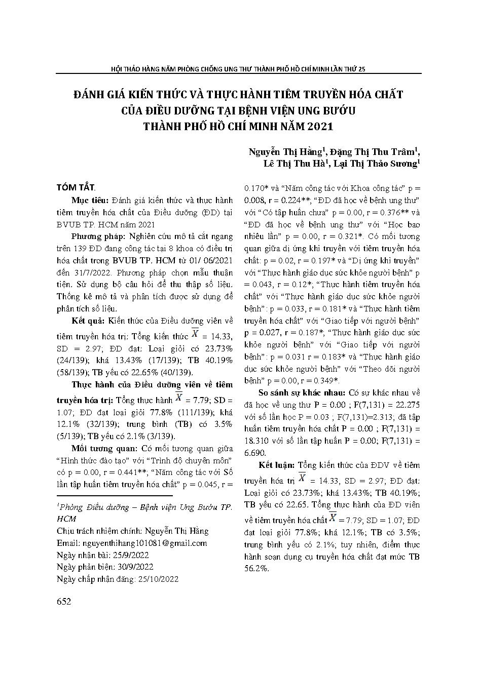 Đánh giá kiến thức và thực hành tiêm truyền hóa chất của điều dưỡng tại Bệnh viện Ung bướu thành phố Hồ Chí Minh năm 2021 = Evaluation of knowledge and practicing in injection chemical of nurses at Ho Chi Minh city onology hospital in 2021