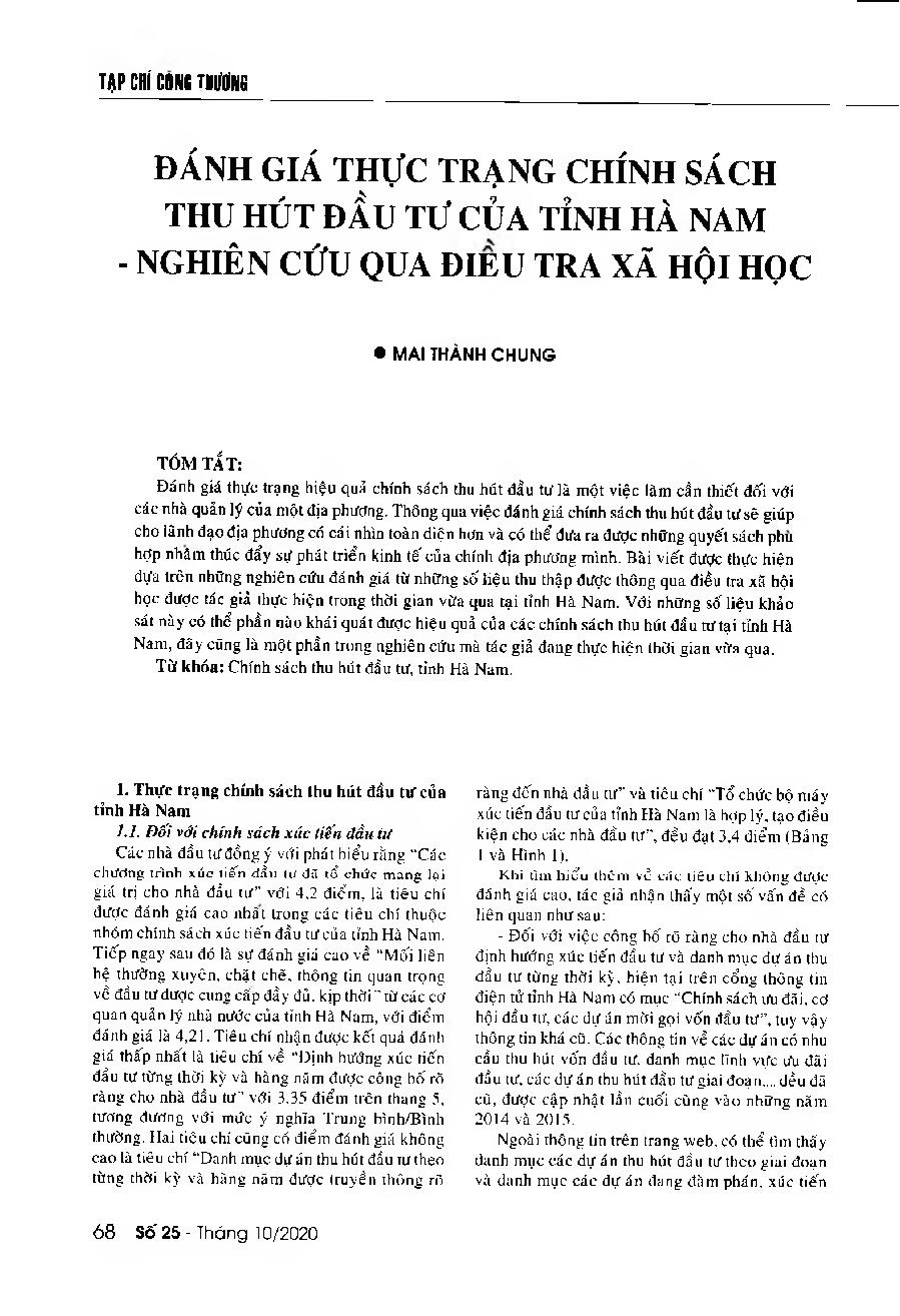 Đánh giá thực trạng chính sách thu hút đầu tư của tỉnh Hà Nam - Nghiên cứu qua điều tra xã hội học = Evaluating the effectiveness of Ha Nam Province's investment attraction policies through sociological surveys