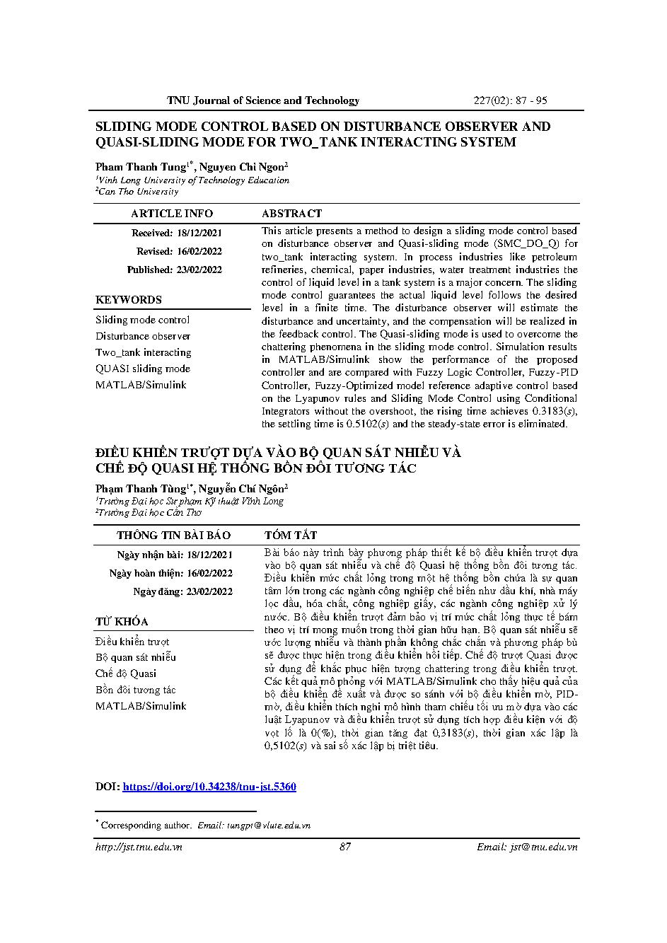 Điều khiển trượt dựa vào bộ quan sát nhiễu và chế độ Quasi hệ thống bồn đôi tương tác = Sliding mode control based on disturbance observer and Quasi-sliding mode for two_tank interacting system