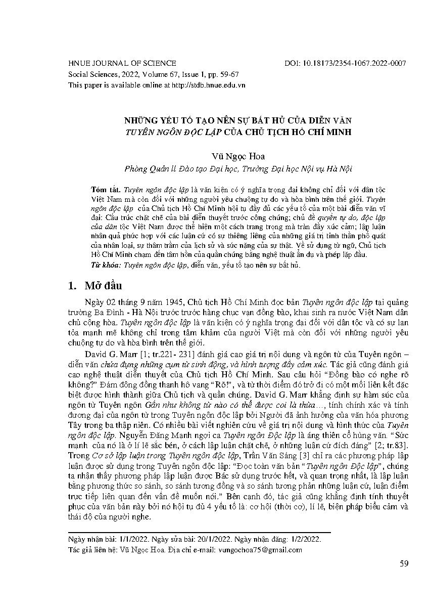 Những yếu tố tạo nên sự bất hủ của diễn văn tuyên ngôn độc lập của chủ tịch Hồ Chí Minh = Elements creating the immortality of the Declaration of independence by the President Ho Chi Minh