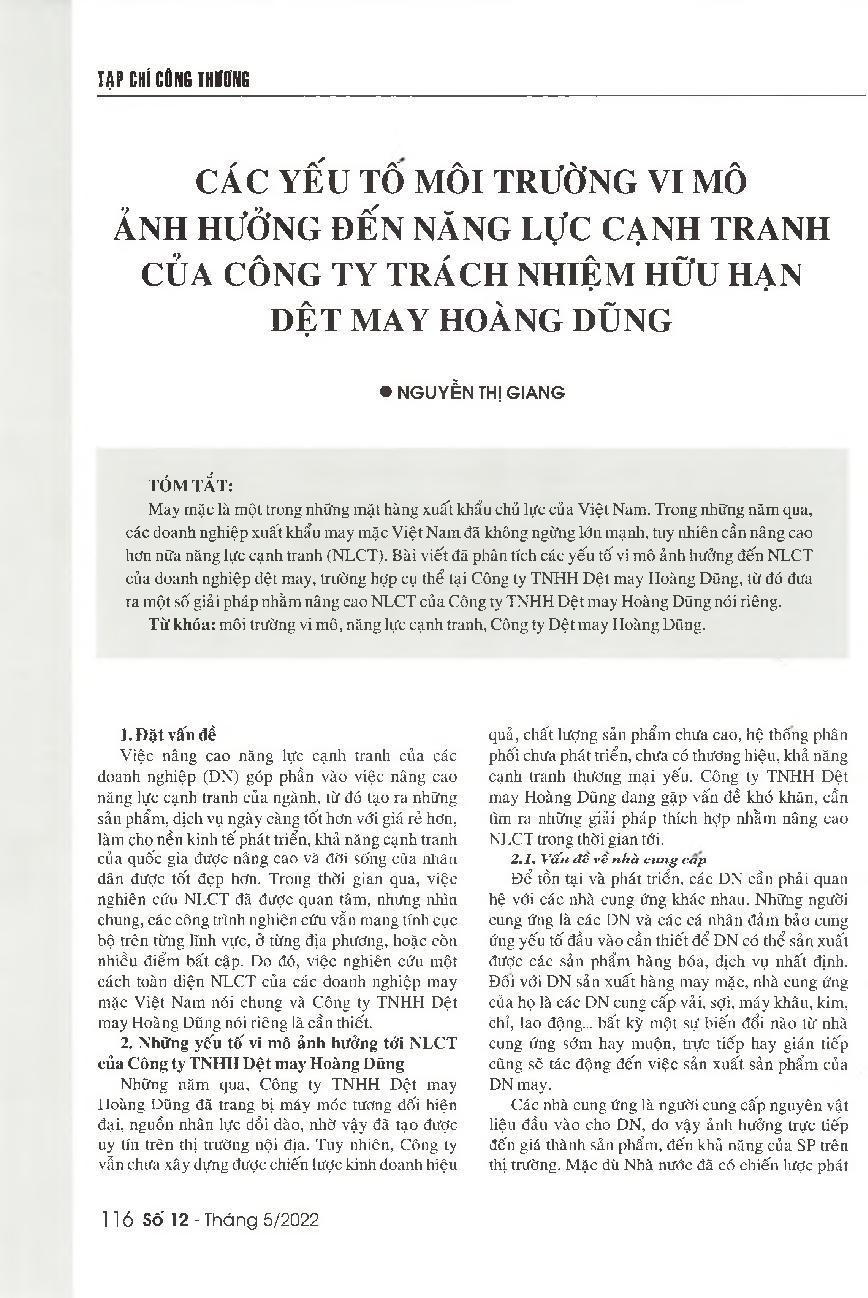 Các yếu tố môi trường vi mô ảnh hưởng đến năng lực cạnh tranh của công ty TNHH Dệt may Hoàng Dũng = Micro-environmental factors affecting the competitiveness of Hoang Dung Textile and Garment Co., Ltd