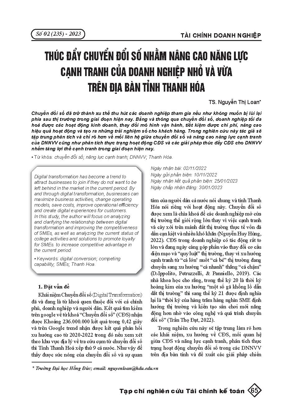 Thúc đẩy chuyển đổi số nhằm nâng cao năng lực cạnh tranh của doanh nghiệp nhỏ và vừa trên địa bàn tỉnh Thanh Hóa = Promote the digital transformation to enhance the competitive capability of small and medium enterprises in Thanh Hoa province