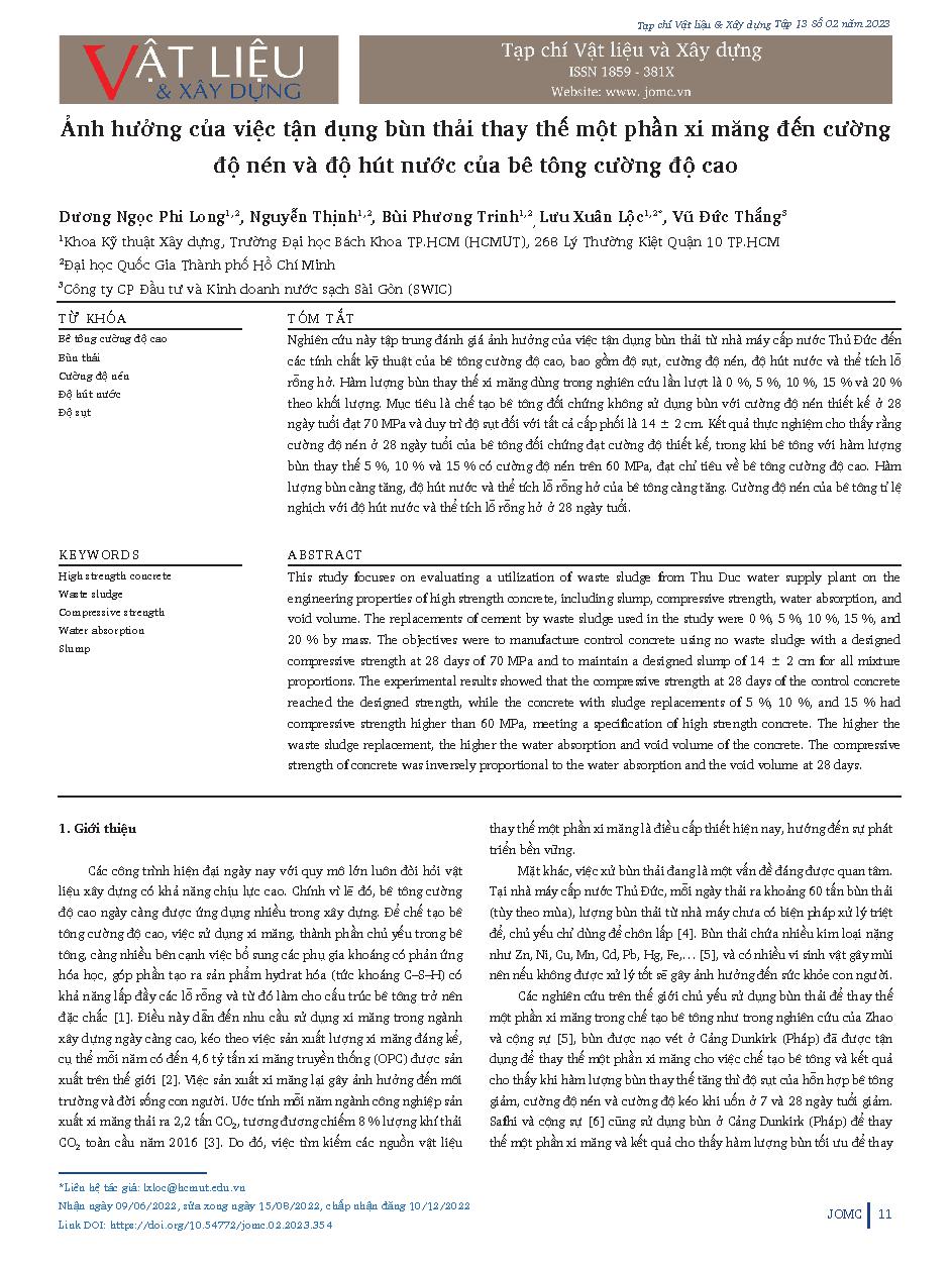 Ảnh hưởng của việc tận dụng bùn thải thay thế một phần xi măng đến cường độ nén và độ hút nước của bê tông cường độ cao