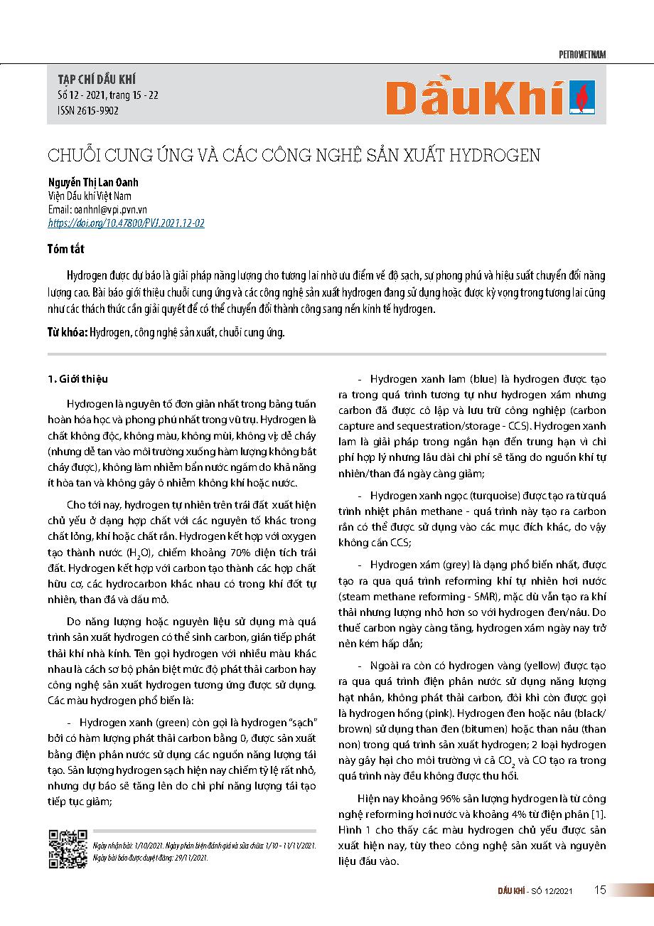 Chuỗi cung ứng và các công nghệ sản xuất hydrogen = Hydrogen supply chain and production technology