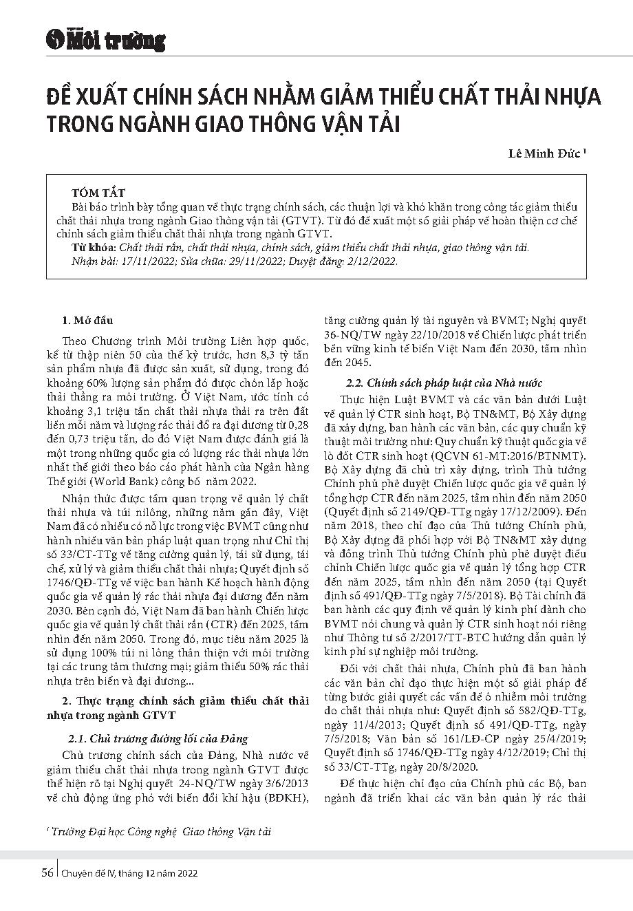 Đề xuất chính sách nhằm giảm thiểu chất thải nhựa trong ngành Giao thông Vận tải = Roposed policy to minimum plastic waste in transportation industry
