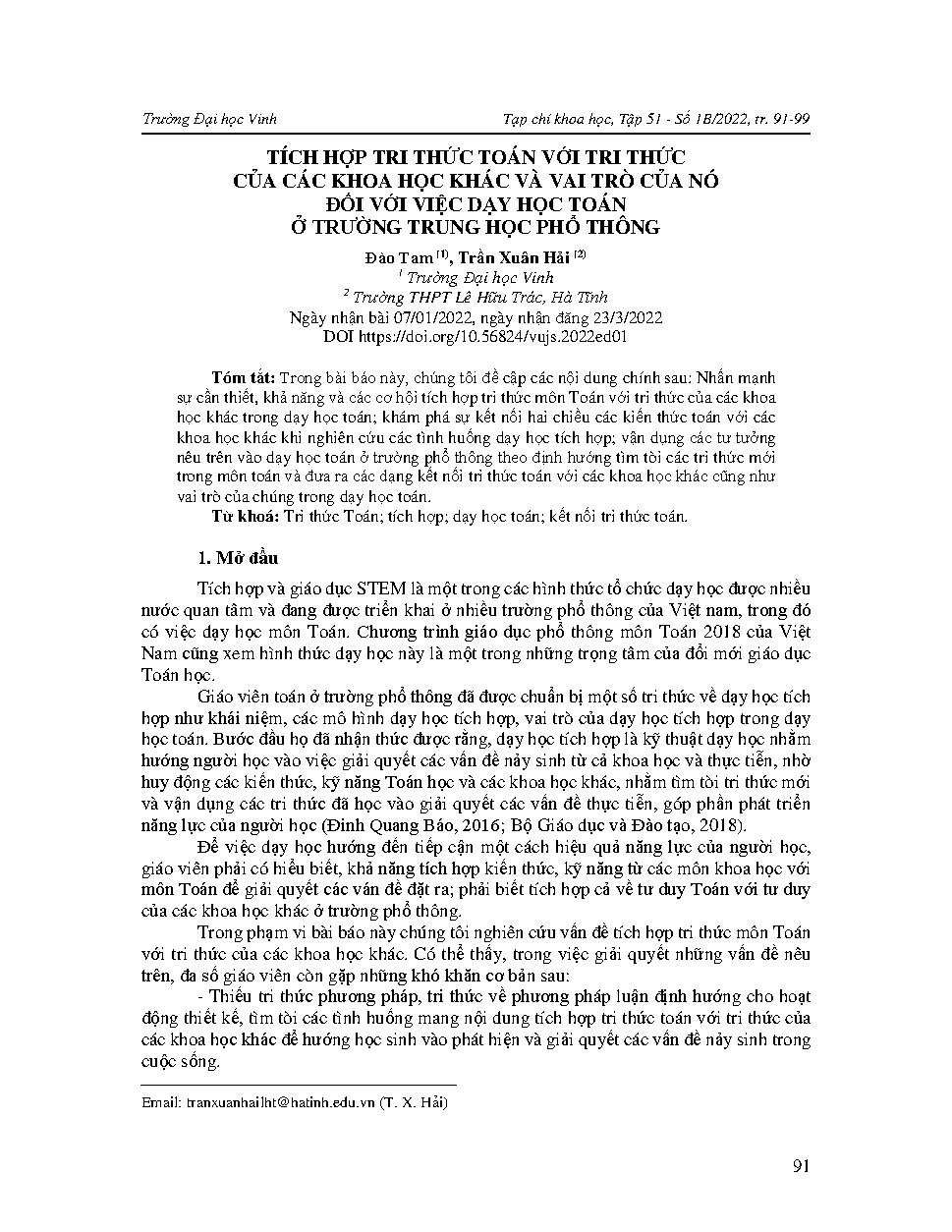 Tích hợp tri thức toán với tri thức của các khoa học khác và vai trò của nó đối với việc dạy học toán ở trường trung học phổ thông = Integrated mathematical knowledge with other scientific knowledge and its role for mathematics teaching at high school