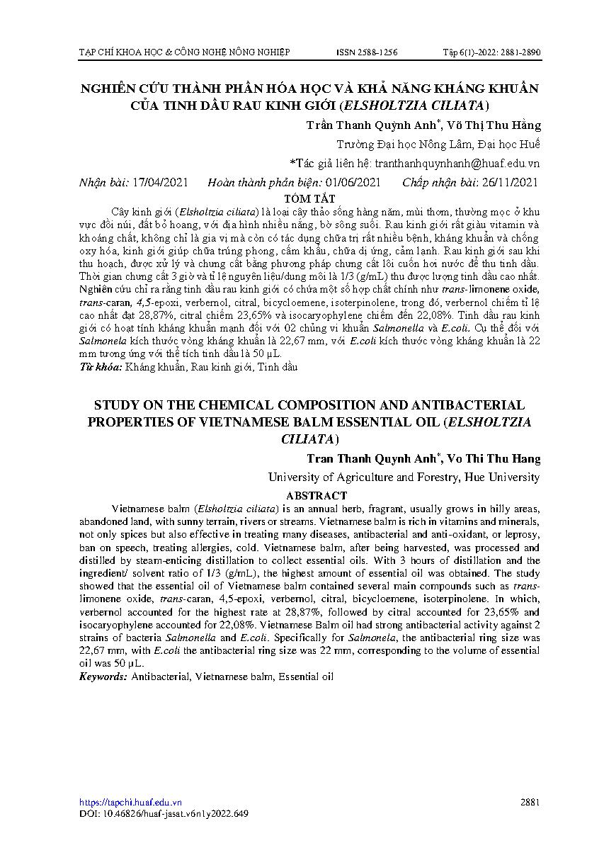 Nghiên cứu thành phần hóa học và khả năng kháng khuẩn của tinh dầu rau kinh giới (Elsholtzia ciliata) = Study on the chemical composition and antibacterial properties of vietnamese balm essential oil (elsholtzia ciliata)