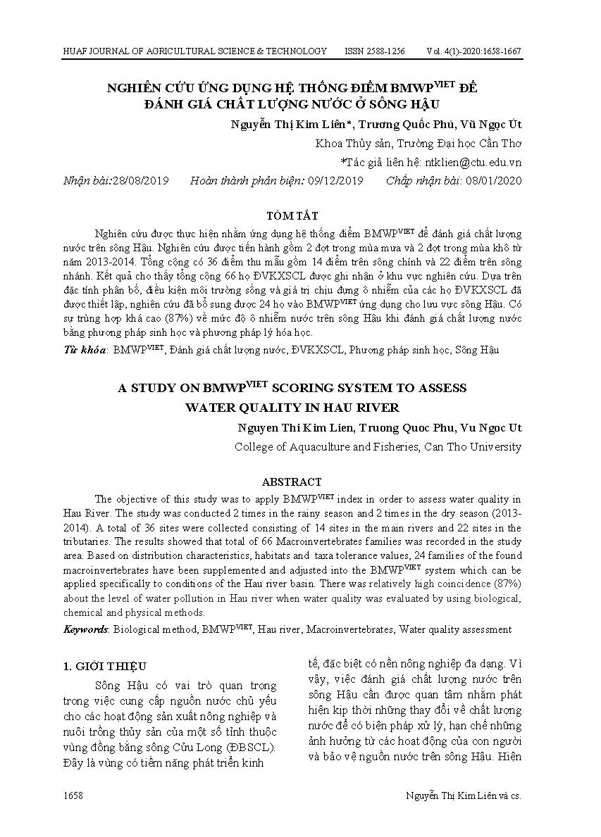 Nghiên cứu ứng dụng hệ thống điểm BMWPviet để đánh giá chất lượng nước ở sông Hậu = A study on BMWPviet scoring system to assess water quality in Hau river