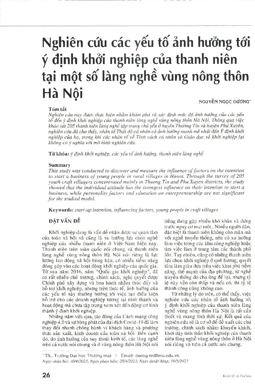 Nghiên cứu các yếu tố ảnh hưởng tới ý định khởi nghiệp của thanh niên tại một số làng nghề vùng nông thôn Hà Nội