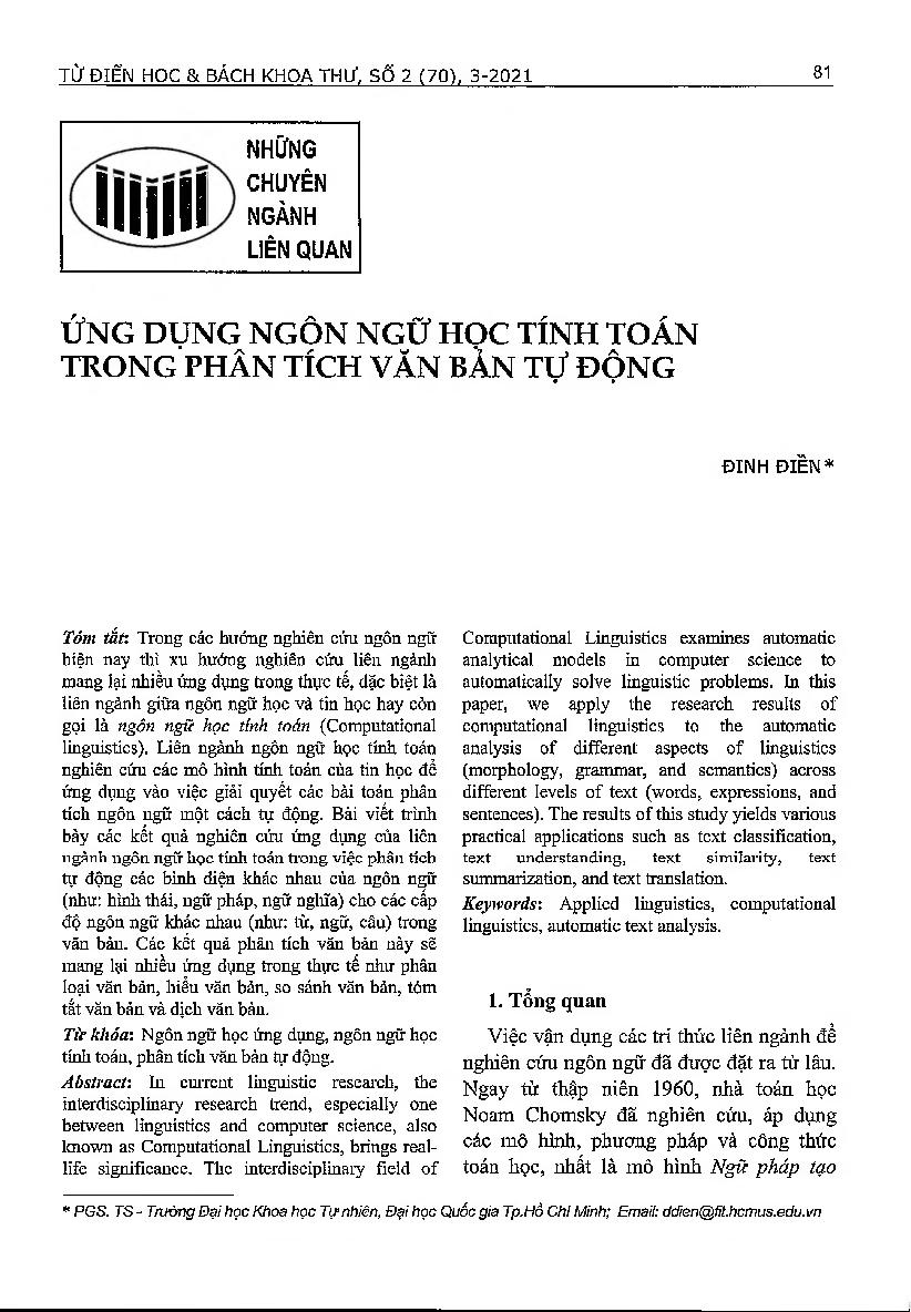 Ứng dụng ngôn ngữ học tính toán trong phân tích văn bản tự động = Application o f computational linguistics ỉn automatic text analysis
