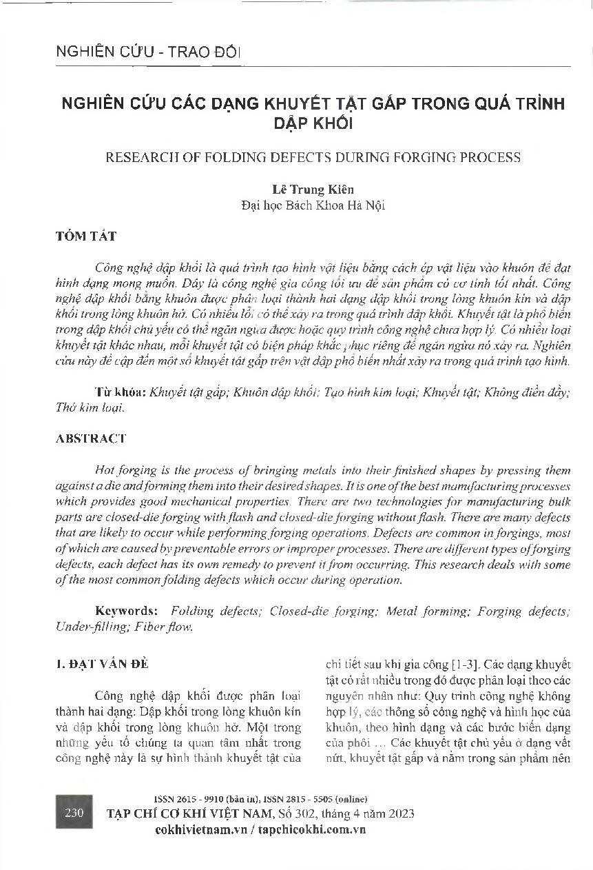 Nghiên cứu các dạng khuyết tật gấp trong quá trình dập khối = Research of folding defects during forging process