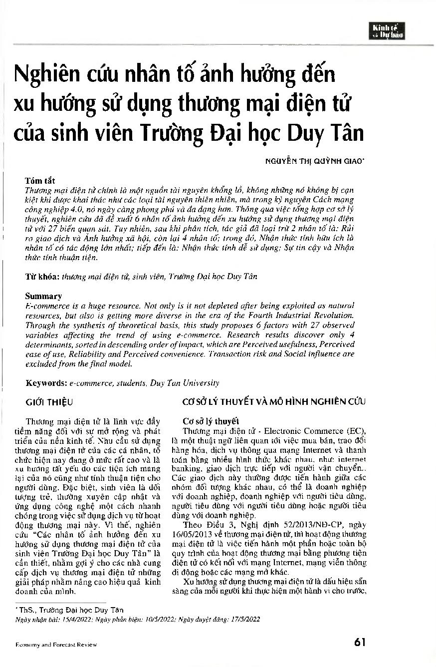 Nghiên cứu nhân tố ảnh hưởng đến xu hướng sử dụng thương mại điện tử của sinh viên Trường Đại học Duy Tân = A study on factors affecting the bend of using e-commerce of students at Duy Tan University