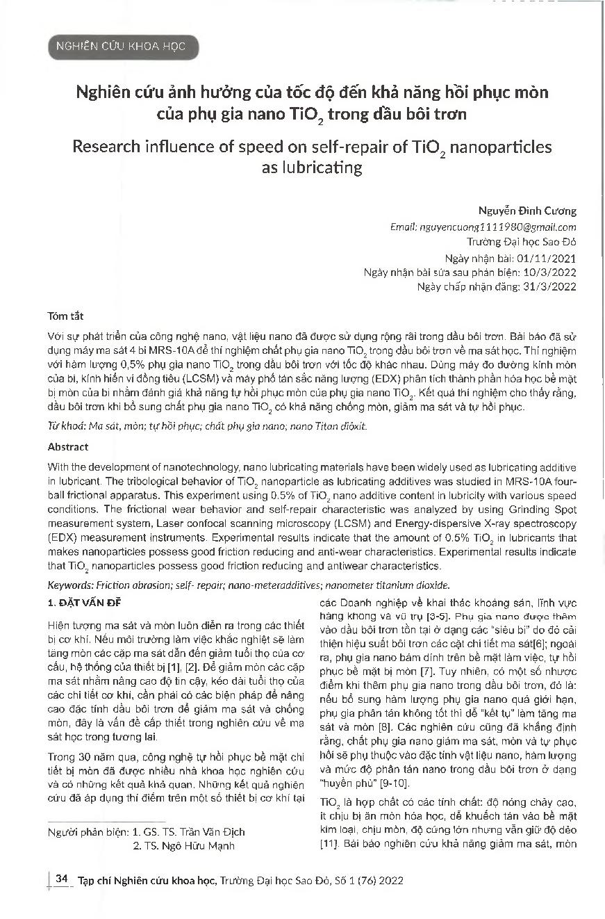 Nghiên cứu ảnh hưởng của tốc độ đến khả năng hồi phục mòn của phụ gia nano TiO2 trong dầu bôi trơn = Research influence of speed on self-repair of TiO2 nanoparticles as lubricating