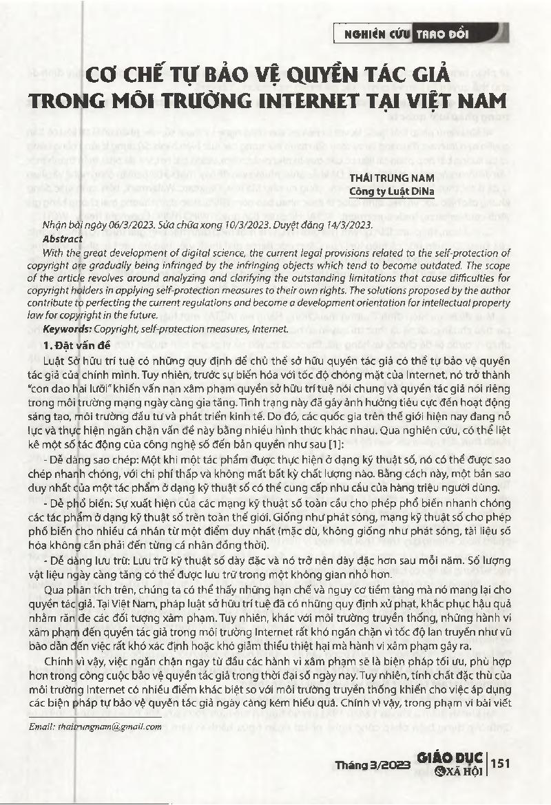 Cơ chế tự bảo vệ quyển tác giả trong môi trường Internet tại Việt Nam = Self-protection mechanism for copyright in the Internet environment in Vietnam.