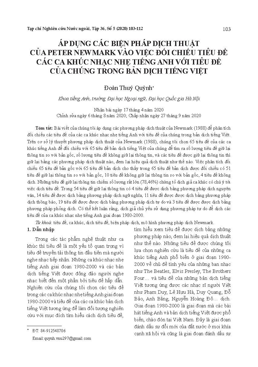 Áp dụng các biện pháp dịch thuật của peter newmark vào việc đối chiếu tiêu đề các ca khúc nhạc nhẹ tiếng Anh với tiêu đề của chúng trong bản dịch tiếng Việt = Comparative study of titles in English pop songs and those in their translated versions based on Newmark’s model