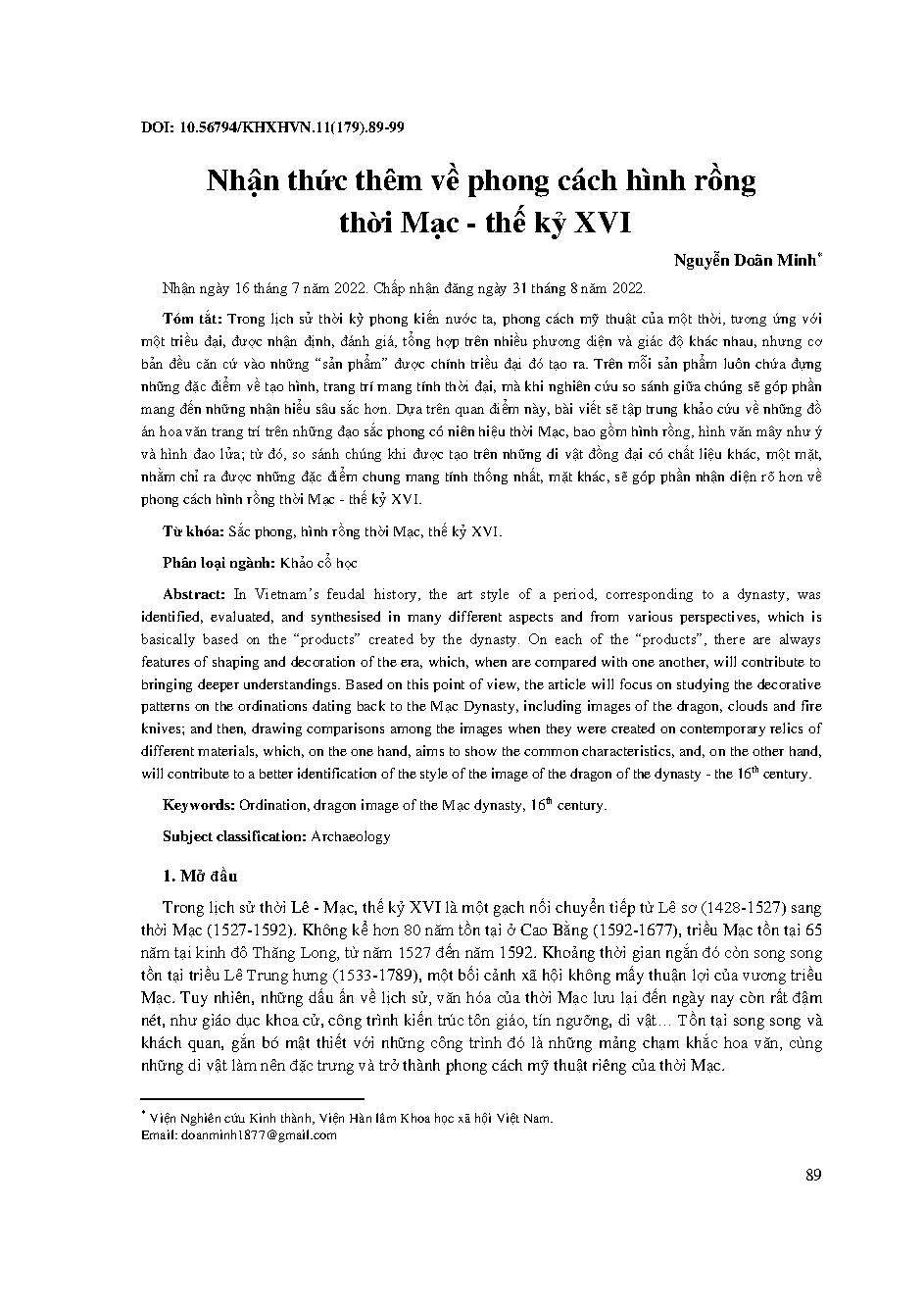 Nhận thức thêm về phong cách hình rồng thời Mạc - thế kỷ XVI = More awareness about the dragon-shaped style of the Mac dynasty - 16th century