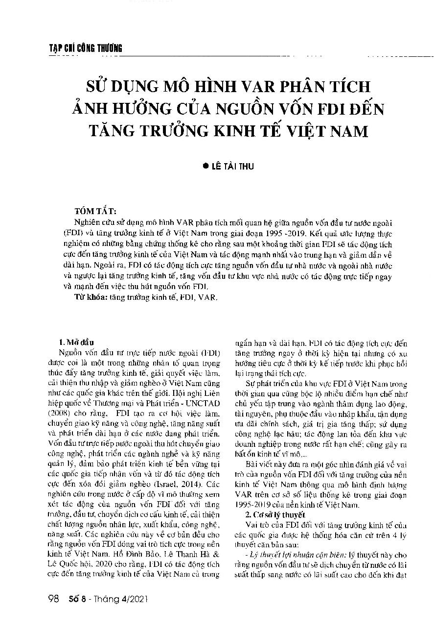 Sử dụng mô hình VAR phân tích ảnh hưởng của nguồn vốn FDI đến tăng trưởng kinh tế Việt Nam