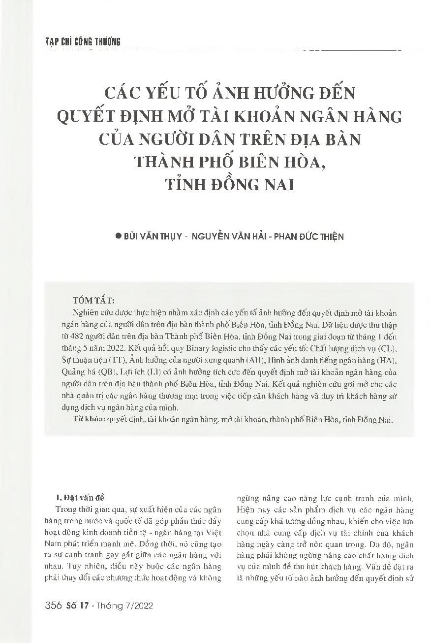 Các yếu tố ảnh hưởng đến quyết định mở tài khoản ngân hàng của người dân trên địa bàn Thành phố Biên Hòa, tỉnh Đồng Nai = Factors affecting the decision to open a bank account of people in Bien Hoa city, Dong Nai province