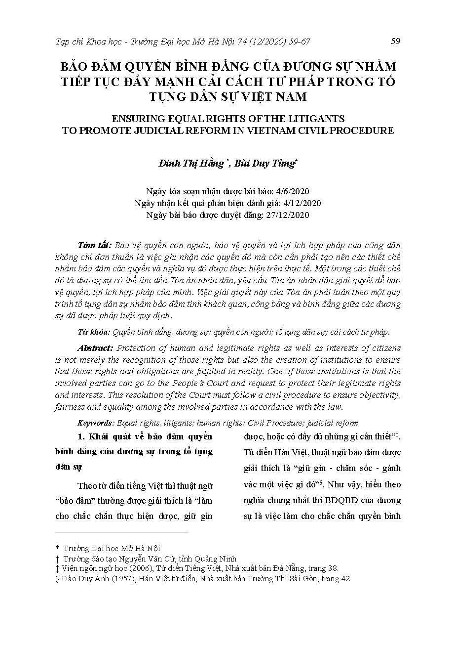 Bảo đảm quyền bình đẳng của đương sự nhằm tiếp tục đẩy mạnh cải cách tư pháp trong tố tụng dân sự Việt Nam = Ensuring equal rights of the litigants to promote judicial reform in Vietnam civil procedure