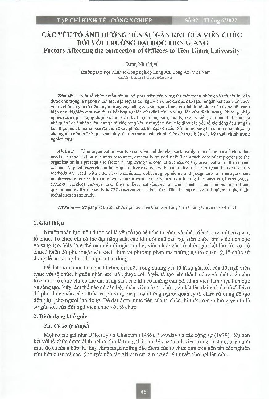 Các yếu tố ảnh hưởng đến sự gắn kết của viên chức đối với Trường Đại học Tiền Giang = Factors Affecting the connection of Officers to Tien Giang University