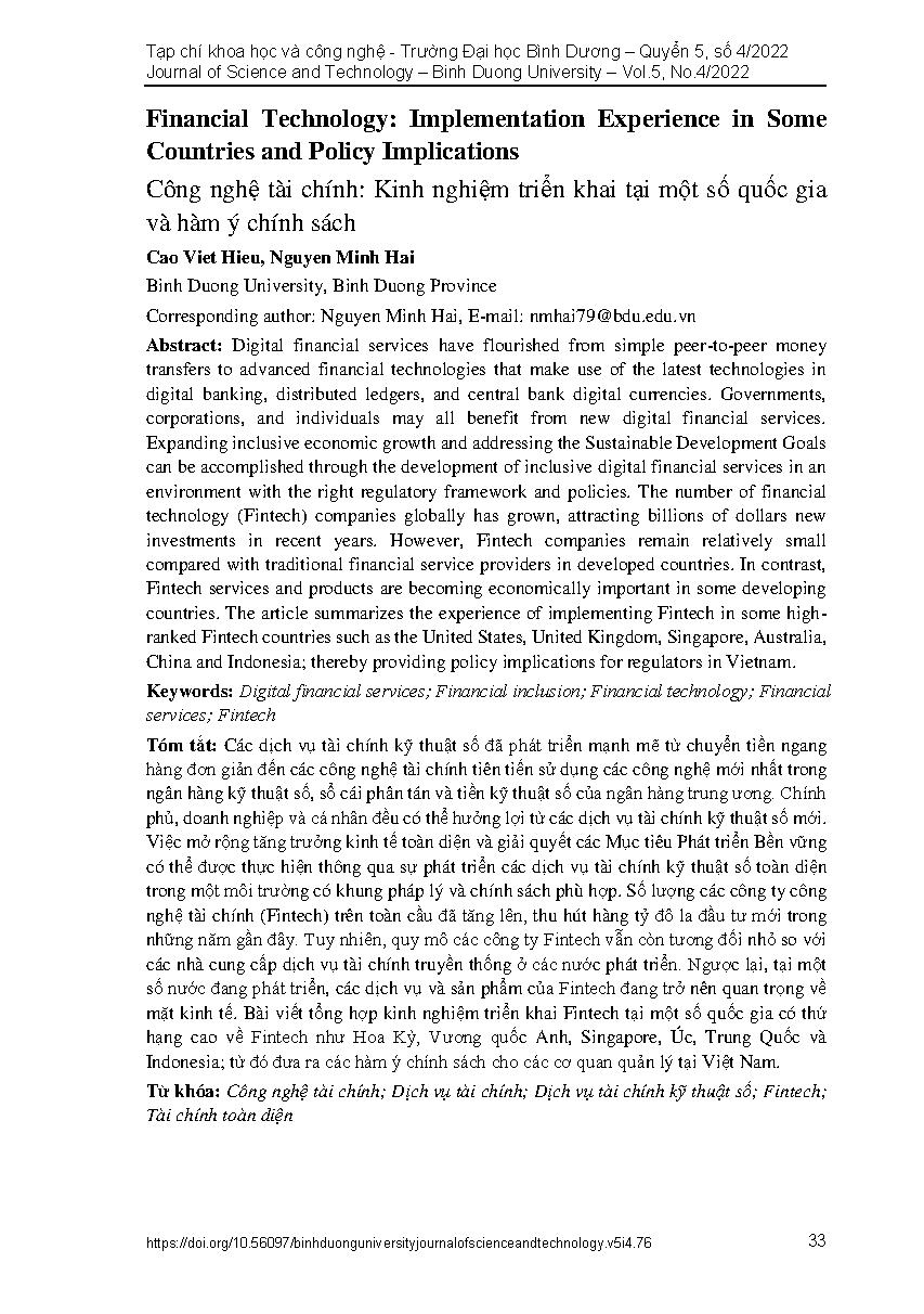Công nghệ tài chính: Kinh nghiệm triển khai tại một số quốc gia và hàm ý chính sách = Financial technology: Implementation experience in some countries and policy implications