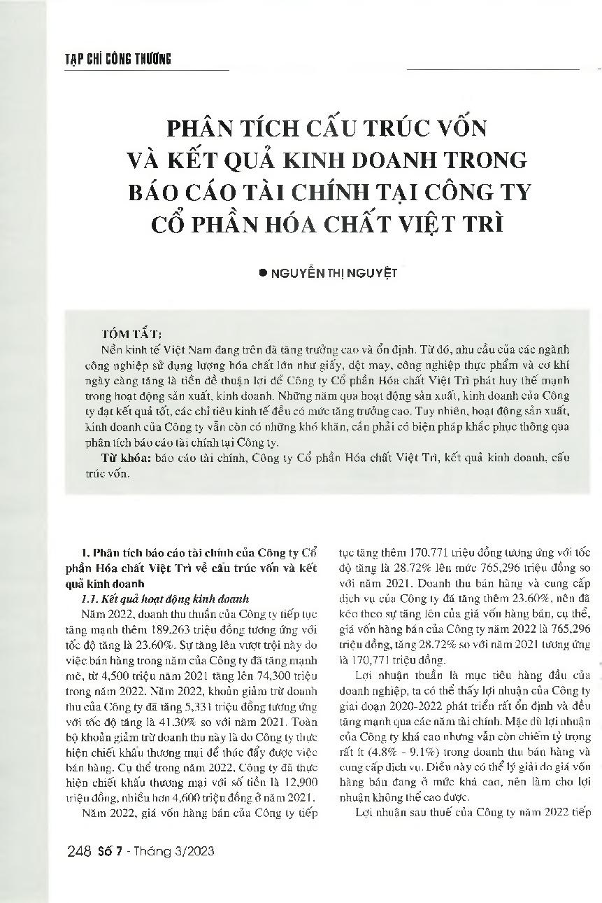 Phân tích cấu trúc vốn và kết quả kinh doanh trong báo cáo tài chính tại Công ty cổ phần Hoá chất Việt Trì = Analyzing the capital structure and the business performance of Viet Tri Chemical Joint stock Company through its financial statements