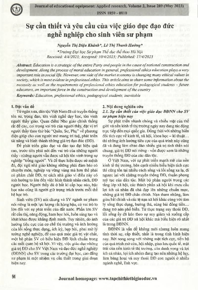 Sự cần thiết và yêu cầu của việc giáo dục đạo đức nghề nghiệp cho sinh viên sư phạm = The need and requirements of professional ethics education for students majoring in Education