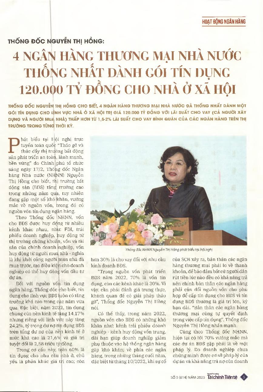 Thống đốc Nguyễn Thị Hồng: 4 Ngân hàng thương mại nhà nước thống nhất dành gói tín dụng 120.000 tỷ đồng cho nhà ở xã hội = Governor Nguyen Thi Hong: 4 state-owned commercial banks agreed to deploy a credit package worth VND 120 trillion for social housing