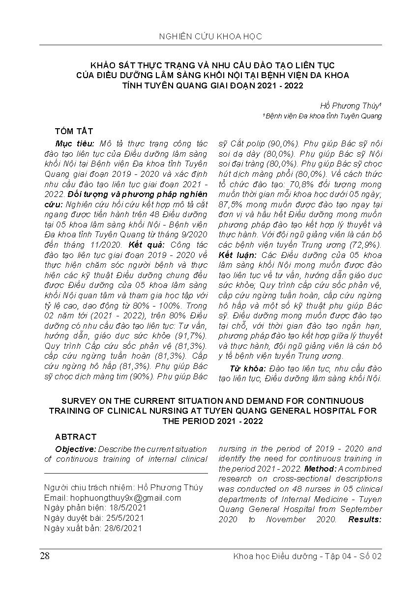 Khảo sát thực trạng và nhu cầu đào tạo liên tục của điều dưỡng lâm sàng khối nội tại bệnh viện đa khoa tỉnh tuyên quang giai đoạn 2021 - 2022 = Survey on the current situation and demand for continuous training of clinical nursing at tuyen quang general hospital for the period 2021 - 2022