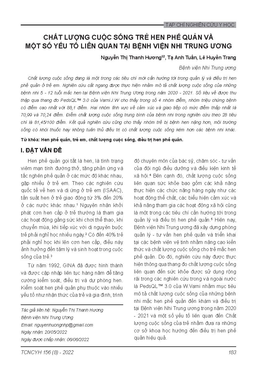 Chất lượng cuộc sống trẻ hen phế quản và một số yếu tố liên quan tại Bệnh viện Nhi Trung ương = Quality of life of children with asthma and associated factors at the Vietnam national children&; 39;s hospital in 2020 -2021
