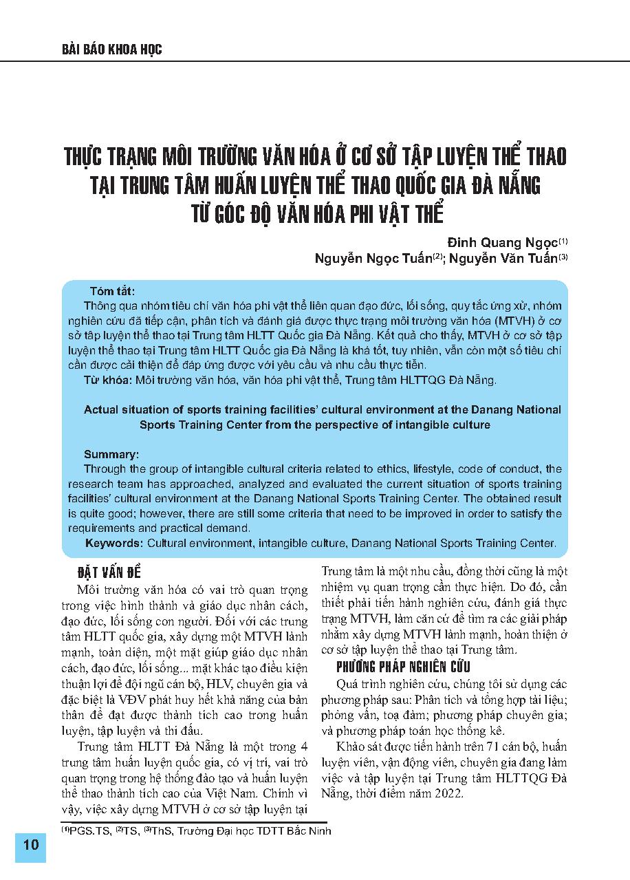 Thực trạng môi trường văn hóa ở cơ sở tập luyện thể thao tại Trung tâm Huấn luyện Thể thao Quốc gia Đà Nẵng từ góc độ văn hóa phi vật thể = Actual situation of sports training facilities’ cultural environment at the Danang National Sports Training Center