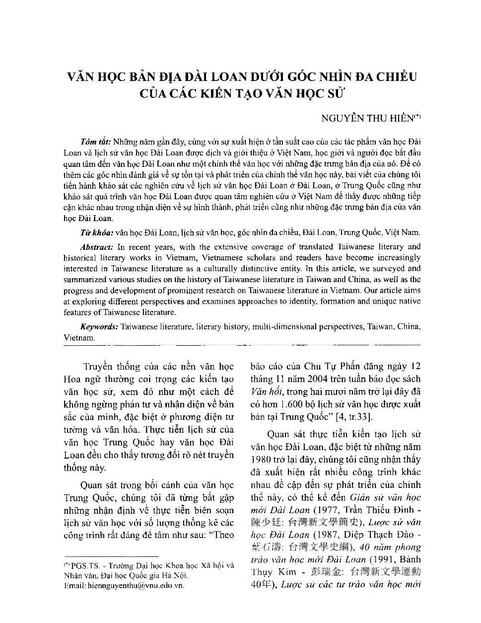 Văn học bản địa Đài Loan dưới góc nhìn đa chiều của các kiến tạo văn học sử = Indigenous Taiwanese literature from diverse perspectives of histories of literature