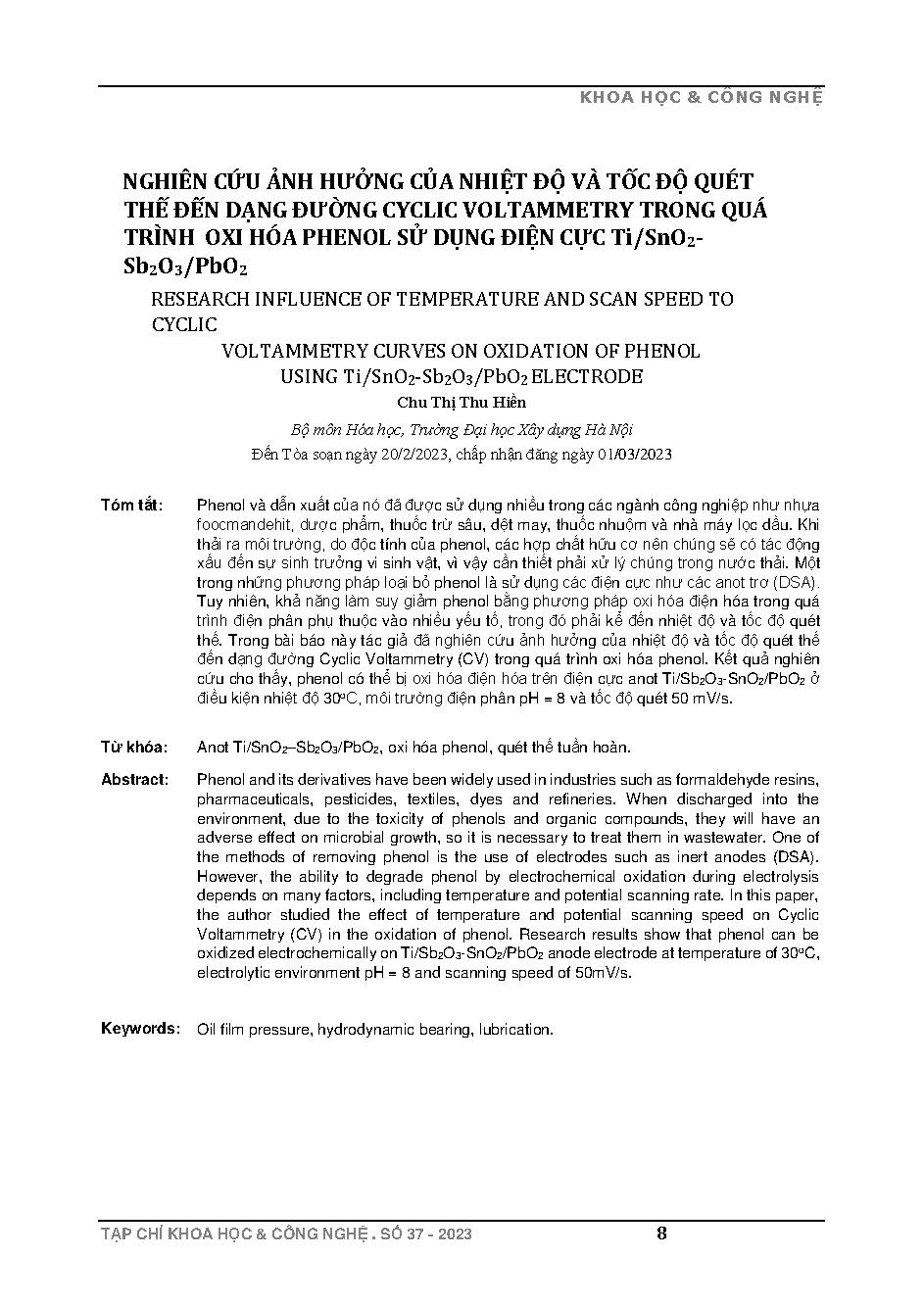 Nghiên cứu ảnh hưởng của nhiệt độ và tốc độ quét thế đến dạng đường cyclic voltammetry trong quá trình oxi hóa phenol sử dụng điện cực Ti/SnO2-Sb2O3/PbO2