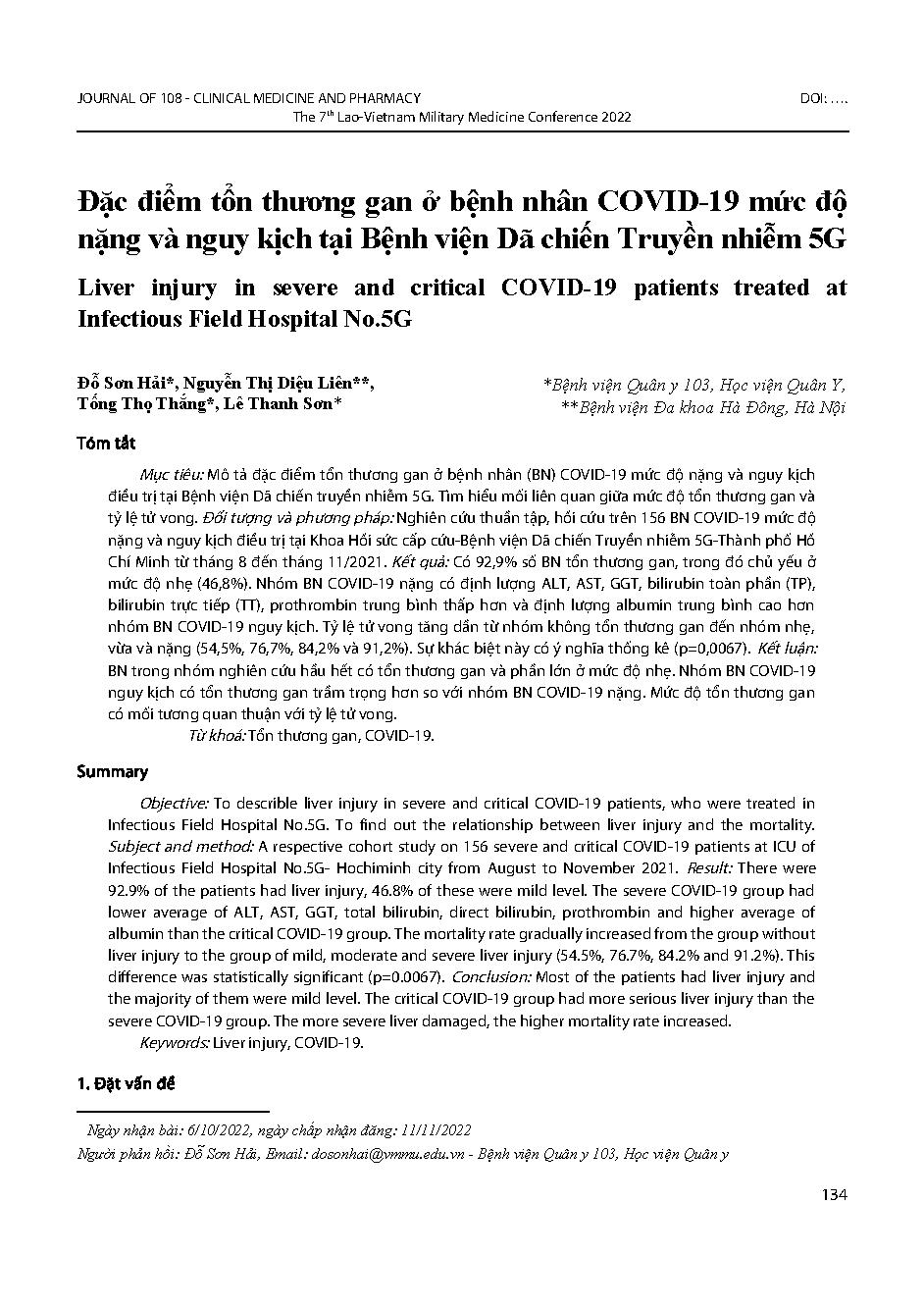 Đặc điểm tổn thương gan ở bệnh nhân COVID-19 mức độ nặng và nguy kịch tại Bệnh viện Dã chiến Truyền nhiễm 5G = Liver injury in severe and critical COVID-19 patients treated at Infectious Field Hospital No.5G