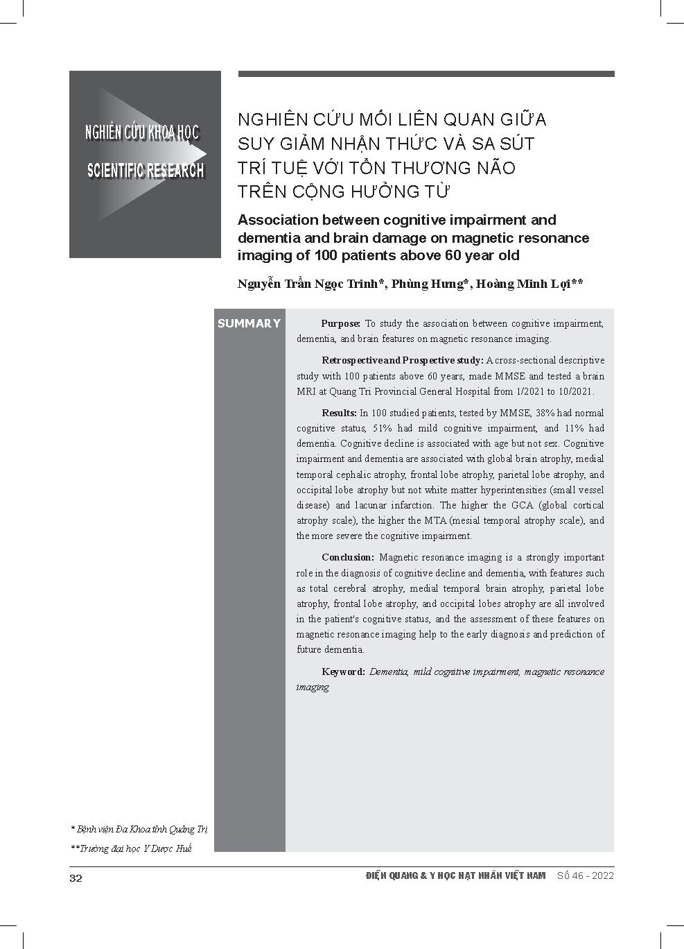 Nghiên cứu mối liên quan giữa suy giảm nhận thức và sa sút trí tuệ với tổn thương não trên cộng hưởng từ