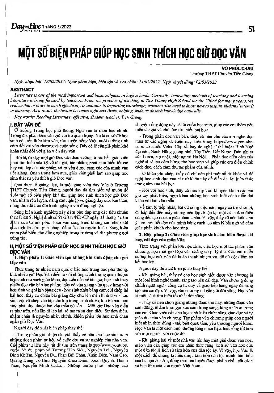 Một số biện pháp giúp học sinh thích học giờ đọc văn = Some measures to help students enjoy the Reading Literature hours