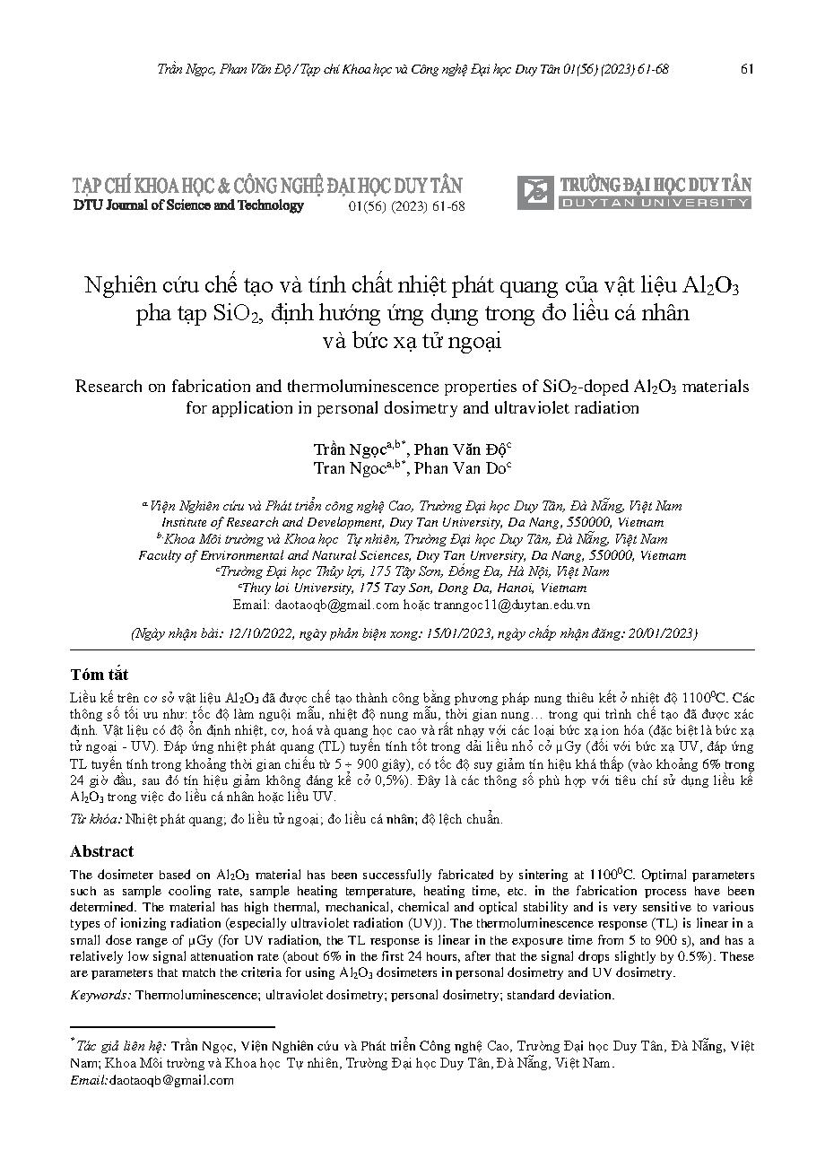 Nghiên cứu chế tạo và tính chất nhiệt phát quang của vật liệu Al2O3 pha tạp SiO2, định hướng ứng dụng trong đo liều cá nhân và bức xạ tử ngoại
