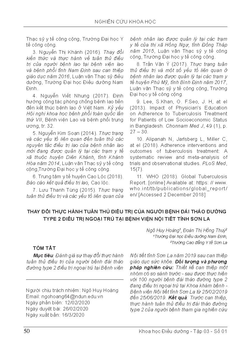 Thay đổi thực hành tuân thủ điều trị của người bệnh đái tháo đường type 2 điều trị ngoại trú tại Bệnh viện Nội tiết tỉnh Sơn La = Changes in adherence to therapies in outpatients with type 2 diabetes mellitus managed by Son La provincial endocrine hospital