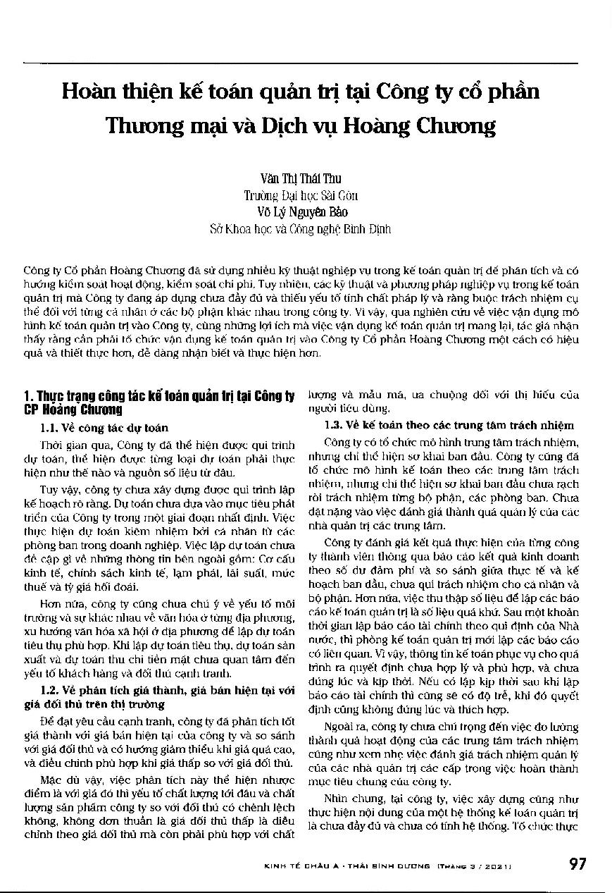 Hoàn thiện kế toán quản trị tại Công ty cổ phần Thương mại và Dịch vụ Hoàng Chương