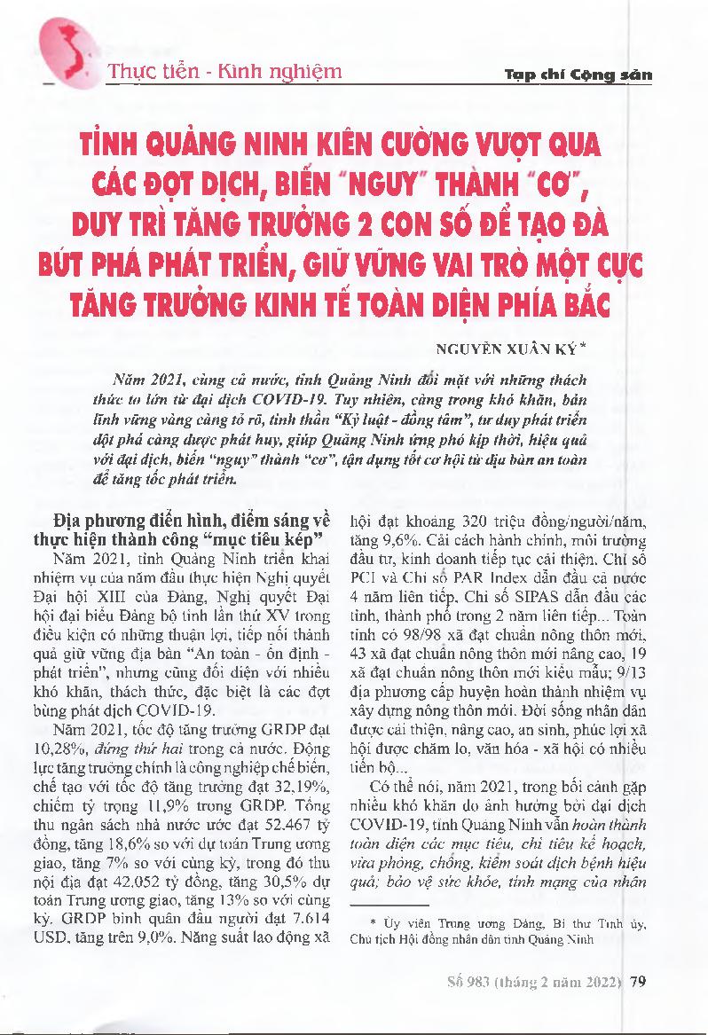 Tỉnh Quảng Ninh kiên cường vượt qua các đợt dịch, biến “nguy” thành “cơ”, duy trì tăng trưởng 2 con số để tạo đà bứt phá phát triển, giữ vững vai trò một cực tăng trưởng kinh tế toàn diện phía Bắc = Quang Ninh province resiliently overcomes epidemics, tur