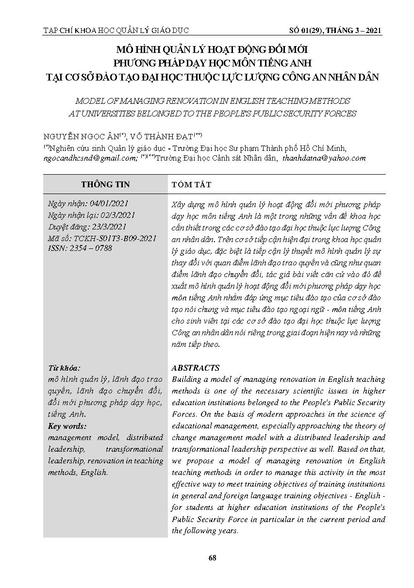 Mô hình quản lý hoạt động đổi mới phương pháp dạy học môn tiếng Anh tại cơ sở đào tạo đại học thuộc lực lượng công an nhân dân = MODEL OF MANAGING RENOVATIONIN ENGLISH TEACHING METHODS AT UNIVERSITIESBELONGED TO THE PEOPLE'S PUBLIC SECURITY FORCES