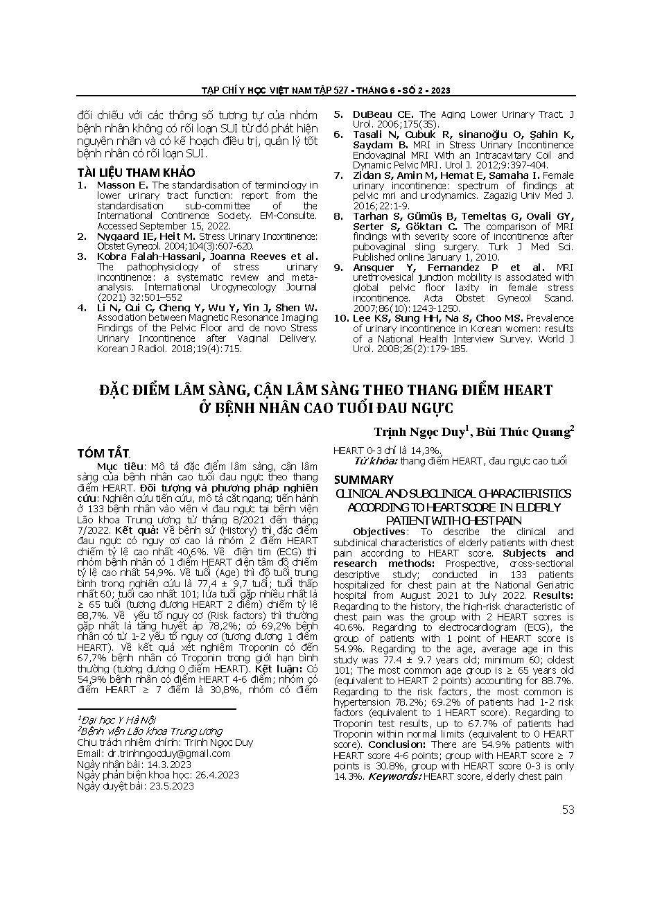 Đặc điểm lâm sàng, cận lâm sàng theo thang điểm HEART ở bệnh nhân cao tuổi đau ngực = Clinical and subclinical characteristics according to heart score in elderly patient with chest pain