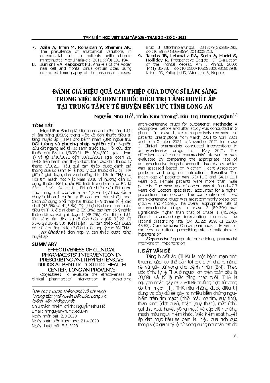 Đánh giá hiệu quả can thiệp của dược sĩ lâm sàng trong việc kê đơn thuốc điều trị tăng huyết áp tại Trung tâm y tế huyện Bến Lức tỉnh Long An = Effectiveness of clinical pharmacists' intervention in prescribing antihypertensive drugs at Ben Luc district h